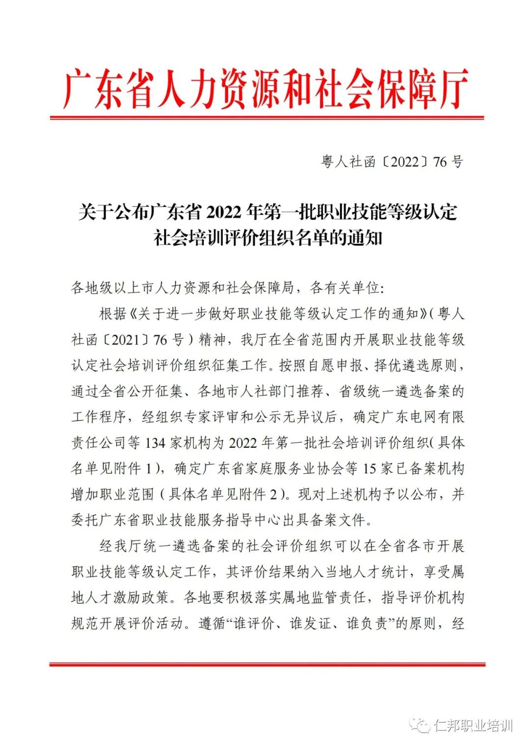 近日,经广东省人力资源和社会保障厅(粤人社函〔2022〕76 号)批准,湛江市仁邦职业培训学校(以下简称:仁邦培训学校)新增养老护理(初级、中级)、美容师(初级、中级)、育婴员(初级、中级)、中式面点师(初级、中级)、西式面点师(初级、中级)五个职业技能等级认定工种。